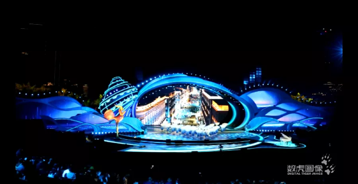 第33届中国电影金鸡奖电影音乐会暨开幕式,节目《大海啊,故乡》 运用裸眼3D多媒体影像从主屏幕沿着两侧波浪起伏状的副舞台铺洒延伸,形成震撼的沉浸式视觉体验。《大鱼》利用三维立体投影将电影《大鱼海棠》精美场景风格化,精彩故事视觉化,将影片画面质感与色彩还原于沉浸式舞台。