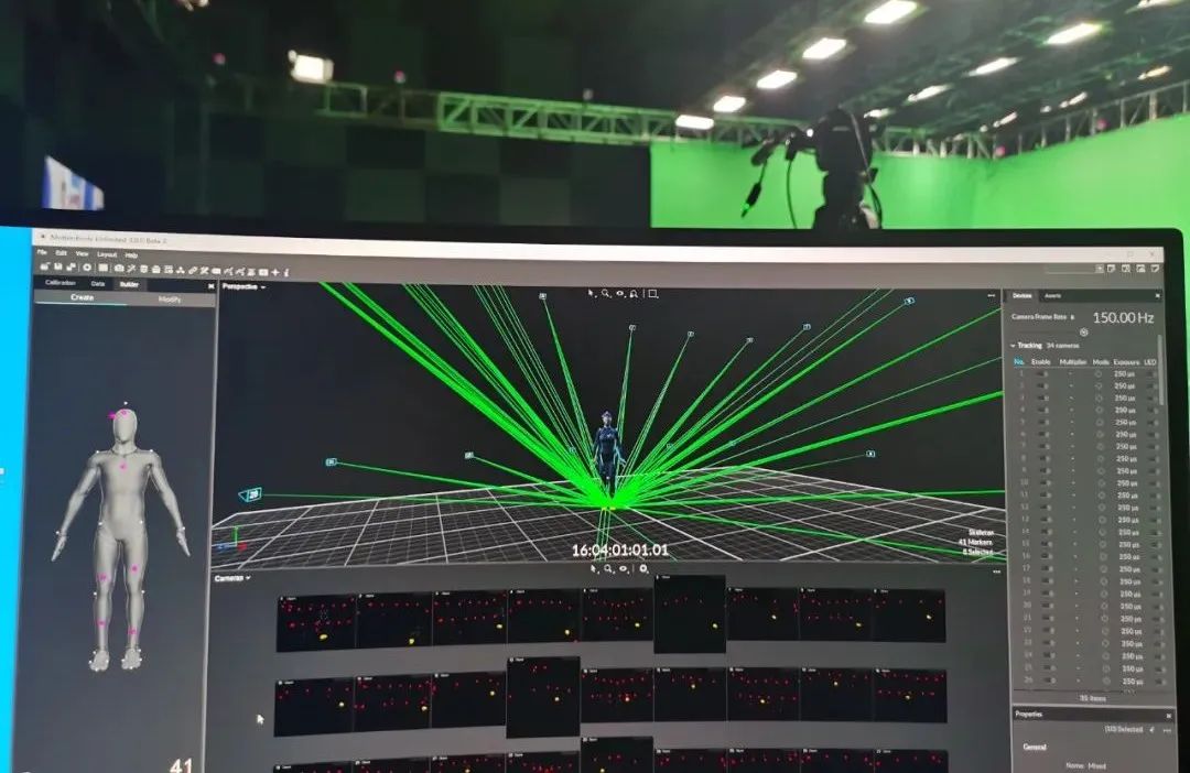 拍摄过程中,今年会·(jinnianhui)金字招牌虚拟动点在现场架设了34台Optitrack动捕摄像机,运用Motive3.0软件对动捕演员的身体动作进行识别、分析,形成骨骼数据,并将骨骼数据流传输至Motionbuilder,实时驱动数字主持人“小漾”,为其注入活力,模拟完成主持人的工作。同时配合节目组进行与主持人间的对位,保障动捕系统与AR实时渲染端系统的正常对接、现场多系统间的时码同步,确保节目顺利进行。
